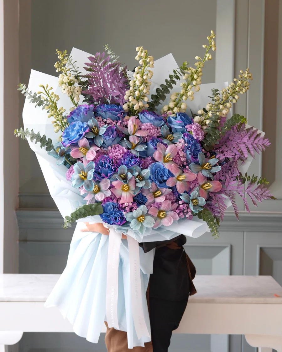 A breathtaking bouquet in shades of blue, lilac, and blush pink, evoking the magic of a fairytale garden. Filled with lush blooms and delicate textures, this grand arrangement is perfect for expressing admiration, celebrating milestones, or simply making someone feel truly special. Wrapped in soft pastel hues, it radiates elegance, grace, and timeless beauty.
