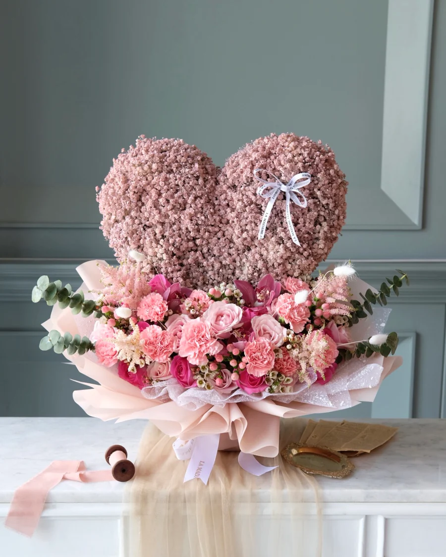 A stunning heart-shaped bloom crafted from soft pink gypsophila, paired with a lush mix of roses, carnations, and delicate textures in romantic blush tones. This arrangement is the perfect expression of everlasting love and affection, making it a meaningful gift for anniversaries, milestones, or any heartfelt celebration.